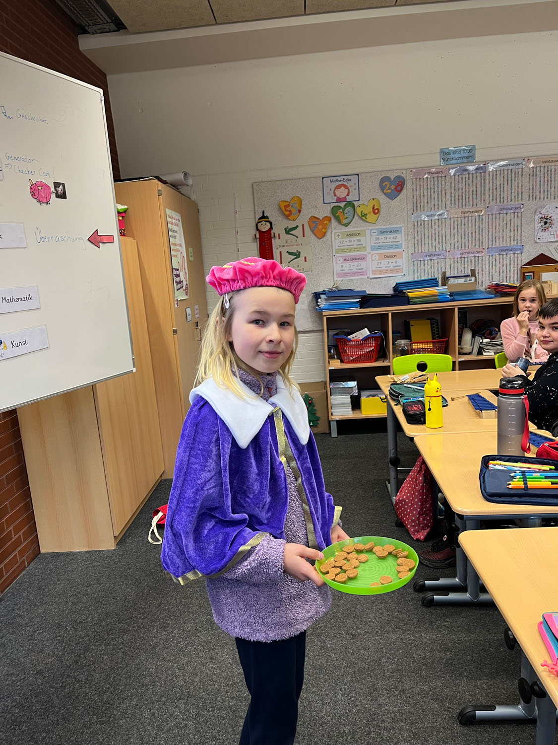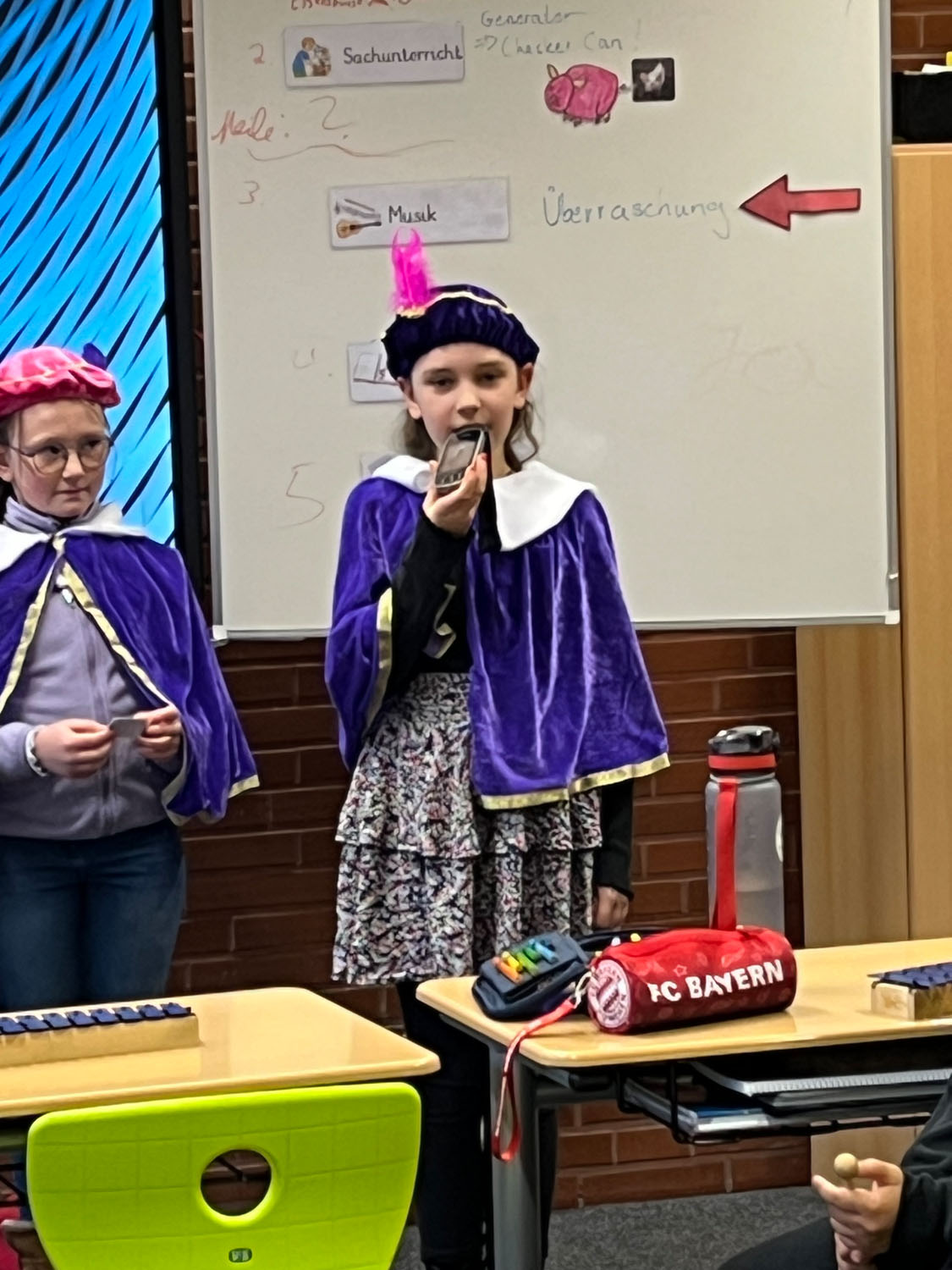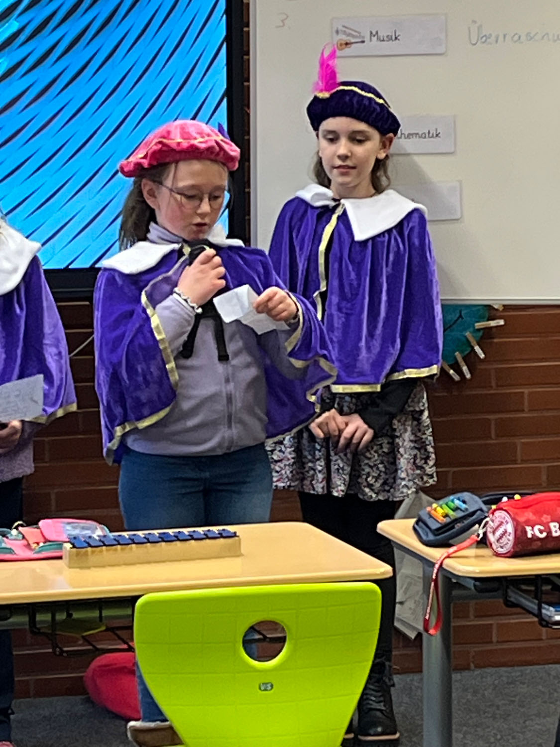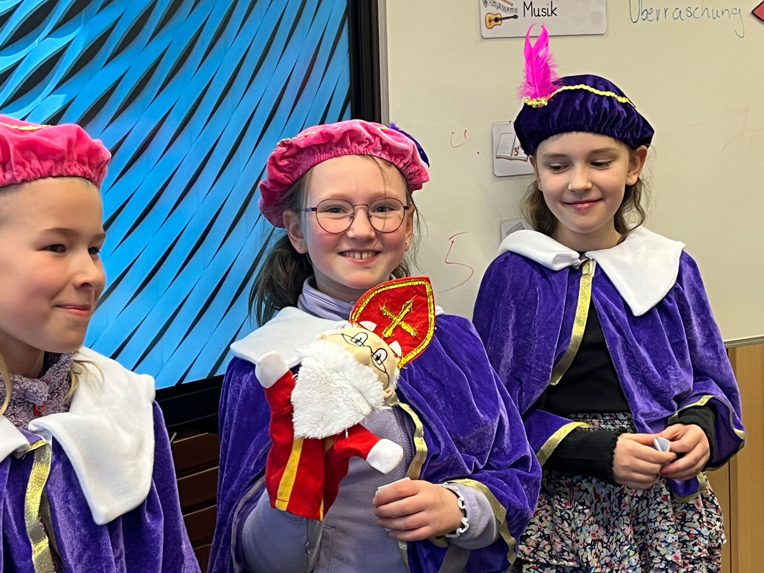 In den Niederlanden kommt der Sinterklaas und dann – nämlich am 5.12. gibt es auch schon die Geschenke für die Kinder. Einige Schüler unserer Schule kennen diesen Brauch besonders gut, denn sie haben familiäre Verbindungen zu den Niederlanden. Mit viel Freude haben daher einige Viertklässlerinnen aus der Klasse 4b einen kleinen Vortrag mit entsprechendem Gesang vorbereitet. Passend dazu hatten sie sich als Pieten verkleidet und überraschten ihre Mitschüler mit kleinen süßem Gebäck. Zum ersten Adventsimpuls werden die drei Schülerinnen erneut auf der Bühne stehen und der Schulgemeinschaft vom Sinterklaas erzählen und vorsingen. Vielen Dank für eure schöne Einstimmung auf die Adventszeit und den Einblick in die Niederländische Weihnachtskultur. Einfach zauberhaft!