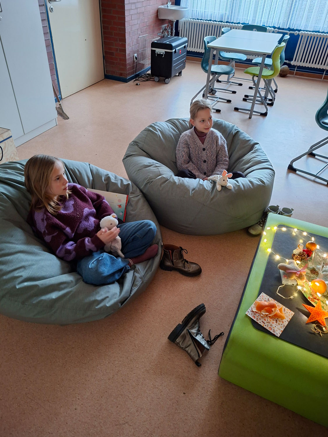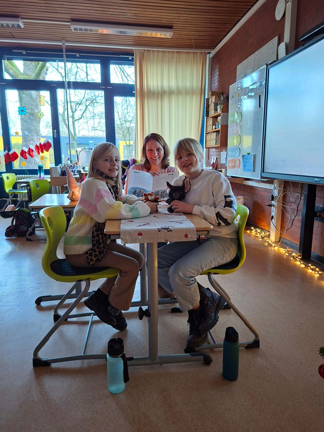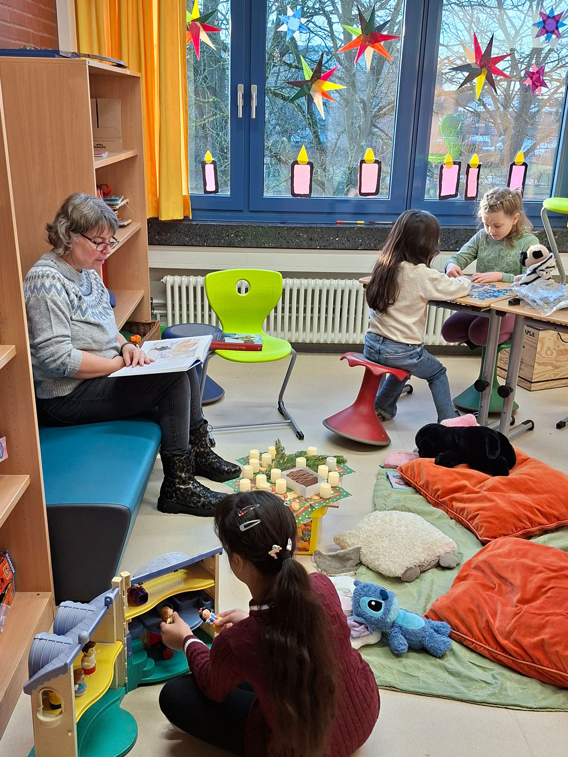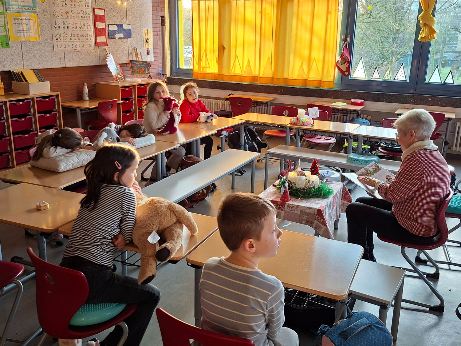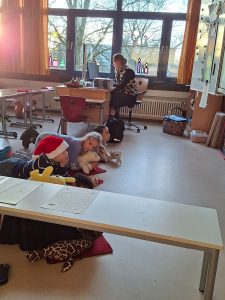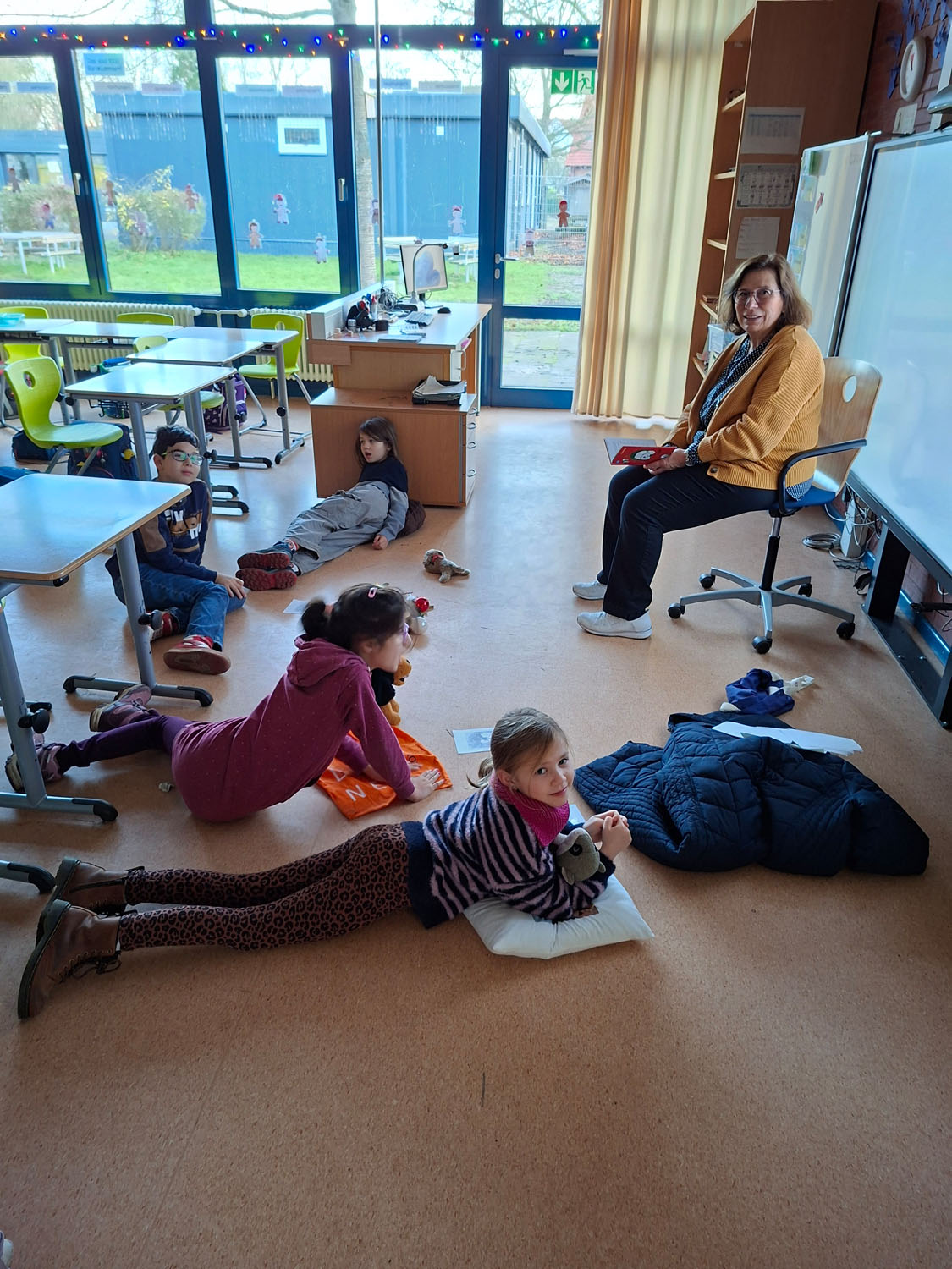 Für den 16. Dezember hatten wir uns für unsere Schulgemeinschaft etwas Besonderes vorgenommen: Wie im vergangenen Jahr wollten wir erneut einen Vorlesetag begehen. Zwanzig ehrenamtliche Vorleser*innen mussten nicht lange gebeten  werden. Gerne folgten sie unserer Einladung, unsere Kinder durch Vorlesen ins Land der Phantasie zu begleiten. Neben Frau Schmiegelt als Vertreterin der Kirchengemeinde über den Ortspolizisten Herrn Meyknecht, vom Haster Bäckermeister Welp  bis zu den Musikern von „Mr. Hurley und die Pulveraffen“ waren auch einige Vertreterinnen des Vereins Mentor, einige Großmütter von Schüler*innen und auch ehemalige Kolleginnen der Grundschule aktiv dabei. Für die kleinen Vorlesegruppen wurden mit Kissen und Decken gemütliche Leseinseln geschaffen, wo es sich den verschiedenen Geschichten herrlich lauschen ließ. Die Kinder hatten von zuhause ihre Kuscheltiere und Kissen mitbringen dürfen, und so breitete sich eine ganz besondere Atmosphäre im Schulgebäude aus. Auch im Mehrgenerationenhaus war Platz geschaffen worden, um all die Gruppen unterbringen zu können. Im Anschluss an das Vorlesen fand dann in der Aula noch ein großer Bücherflohmarkt statt. Gespendete Bücher wechselten für kleines Geld den Besitzer und es konnte so manches Bücher-Schnäppchen gemacht werden, was einen Erlös von über 300 € erbrachte.