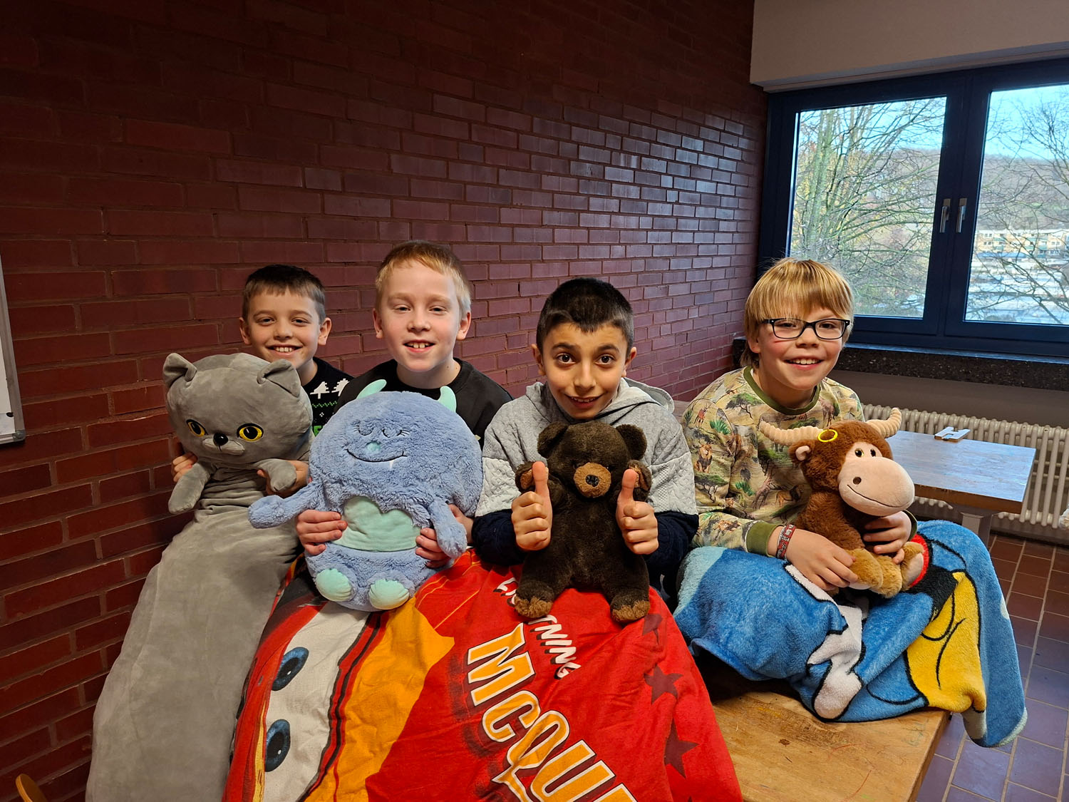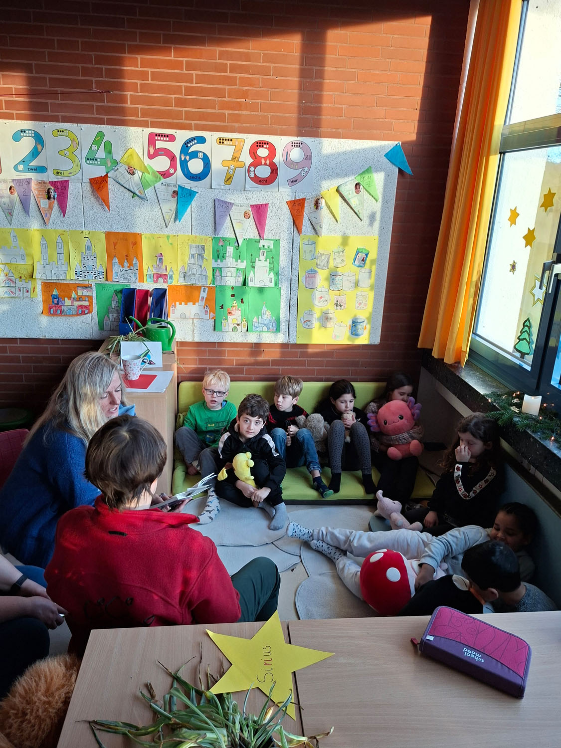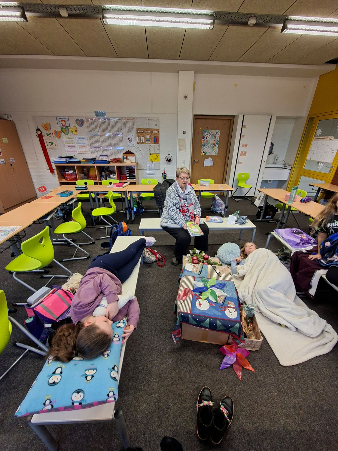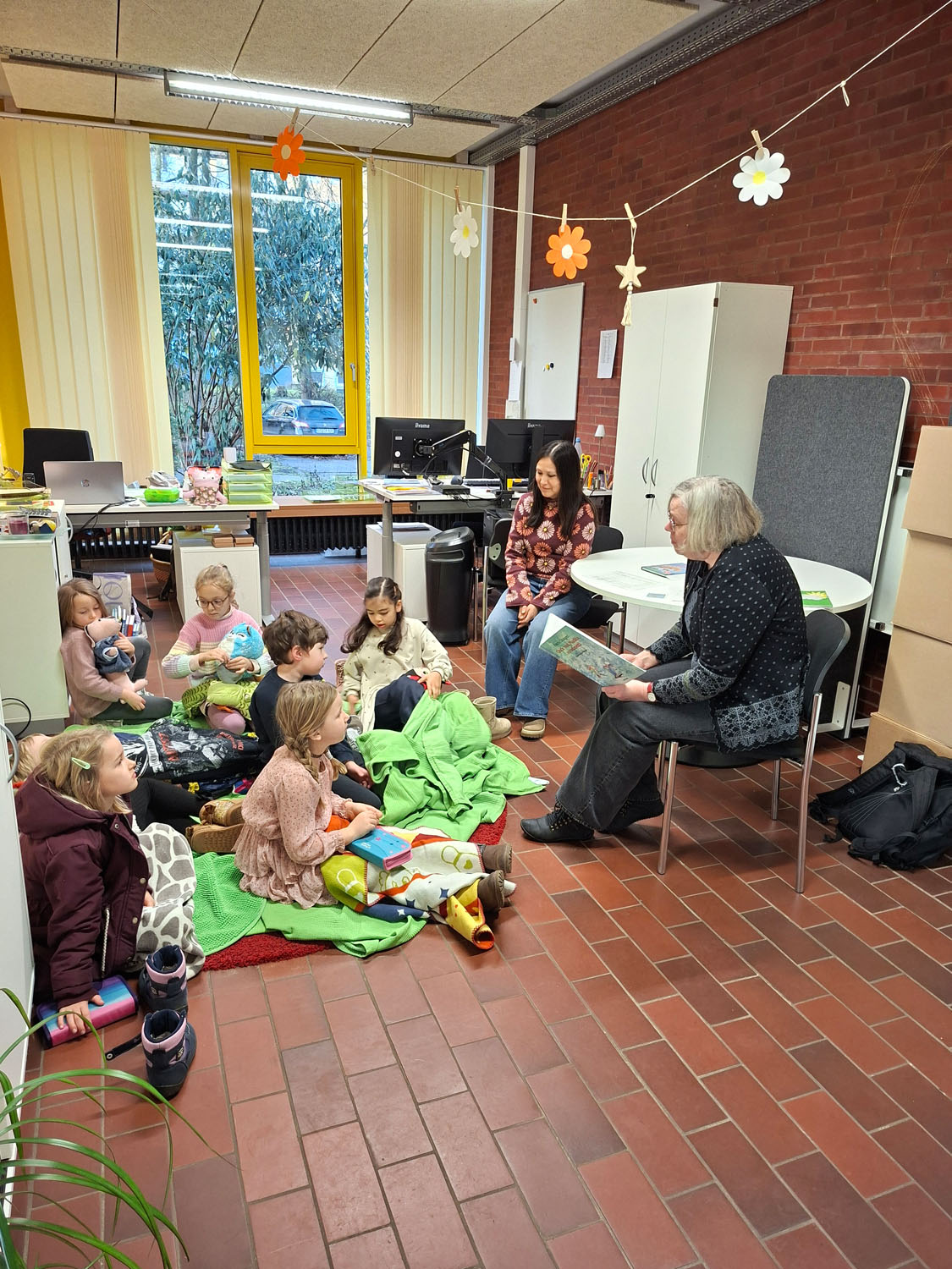 Für den 16. Dezember hatten wir uns für unsere Schulgemeinschaft etwas Besonderes vorgenommen: Wie im vergangenen Jahr wollten wir erneut einen Vorlesetag begehen. Zwanzig ehrenamtliche Vorleser*innen mussten nicht lange gebeten  werden. Gerne folgten sie unserer Einladung, unsere Kinder durch Vorlesen ins Land der Phantasie zu begleiten. Neben Frau Schmiegelt als Vertreterin der Kirchengemeinde über den Ortspolizisten Herrn Meyknecht, vom Haster Bäckermeister Welp  bis zu den Musikern von „Mr. Hurley und die Pulveraffen“ waren auch einige Vertreterinnen des Vereins Mentor, einige Großmütter von Schüler*innen und auch ehemalige Kolleginnen der Grundschule aktiv dabei. Für die kleinen Vorlesegruppen wurden mit Kissen und Decken gemütliche Leseinseln geschaffen, wo es sich den verschiedenen Geschichten herrlich lauschen ließ. Die Kinder hatten von zuhause ihre Kuscheltiere und Kissen mitbringen dürfen, und so breitete sich eine ganz besondere Atmosphäre im Schulgebäude aus. Auch im Mehrgenerationenhaus war Platz geschaffen worden, um all die Gruppen unterbringen zu können. Im Anschluss an das Vorlesen fand dann in der Aula noch ein großer Bücherflohmarkt statt. Gespendete Bücher wechselten für kleines Geld den Besitzer und es konnte so manches Bücher-Schnäppchen gemacht werden, was einen Erlös von über 300 € erbrachte.