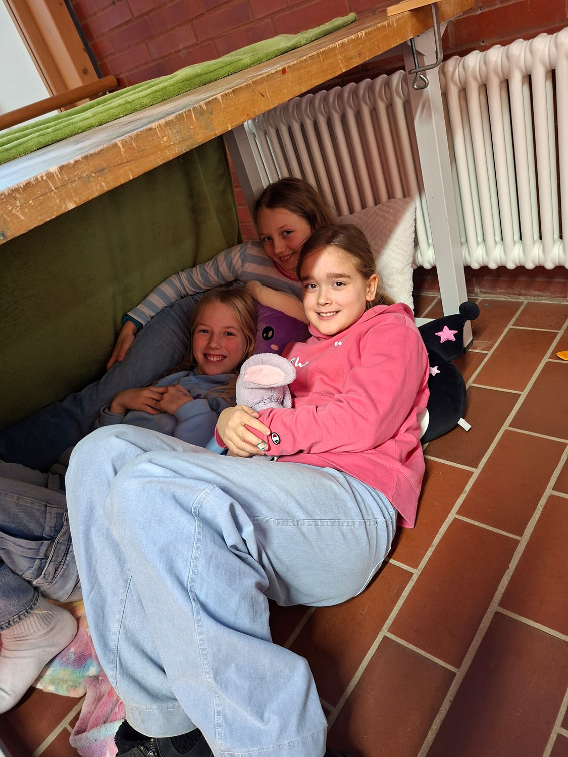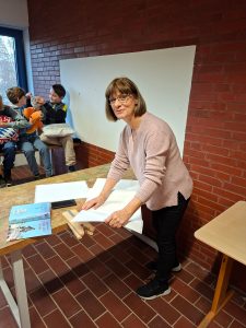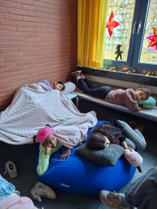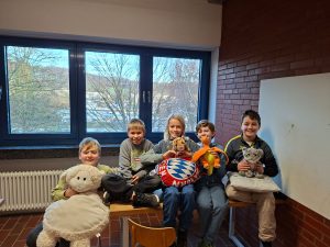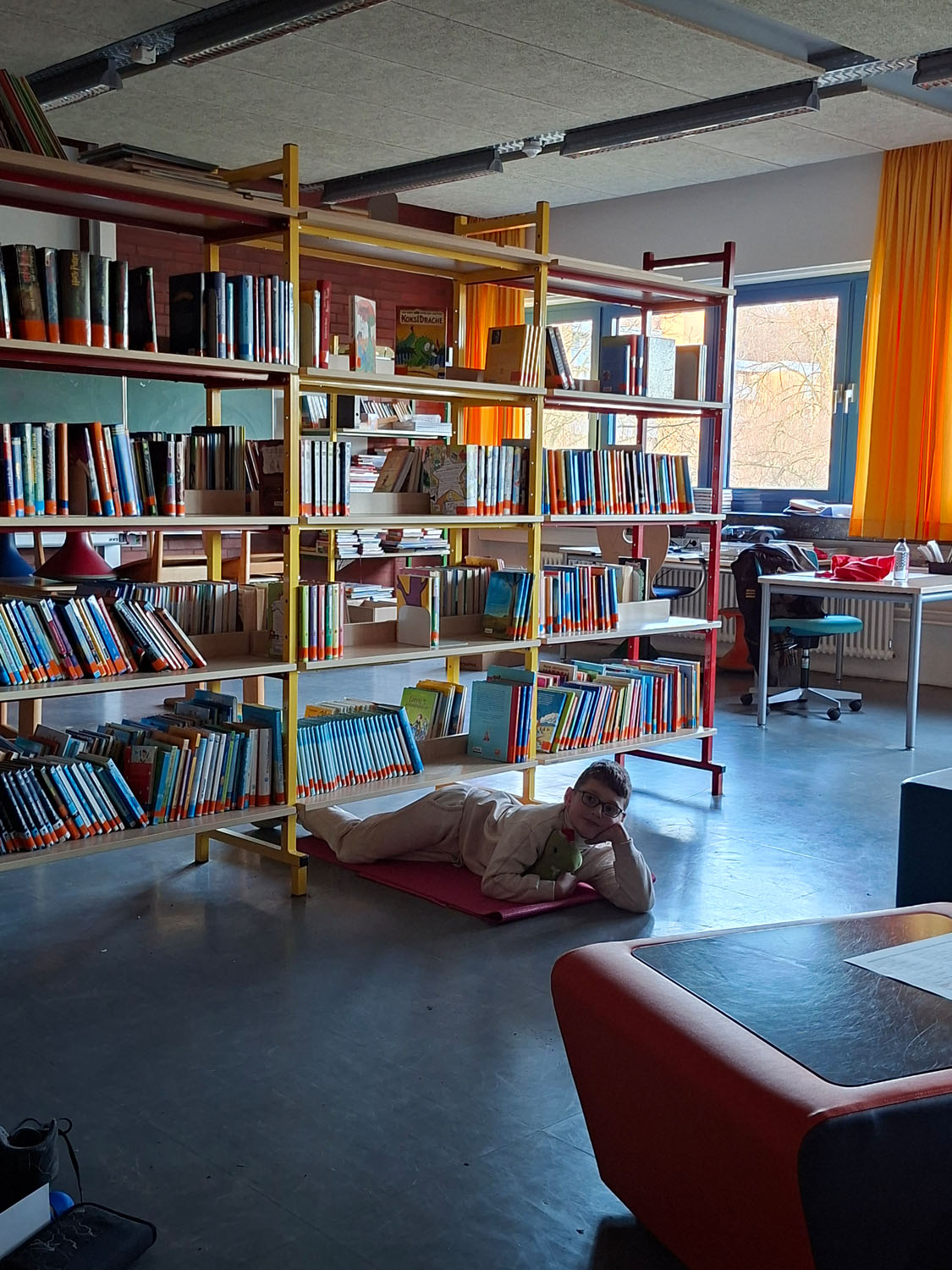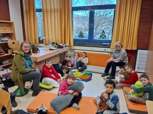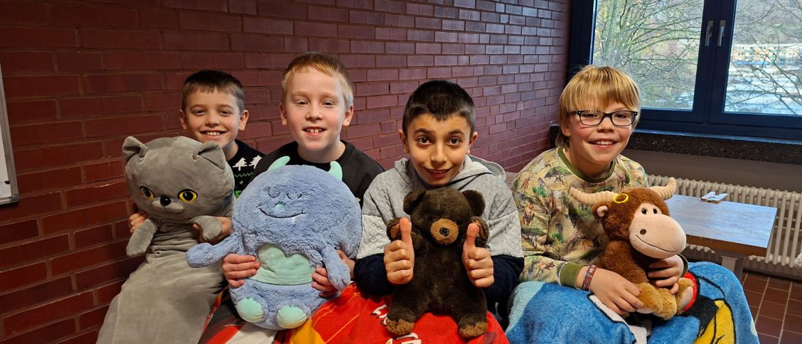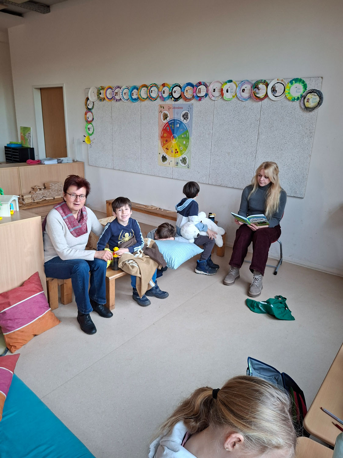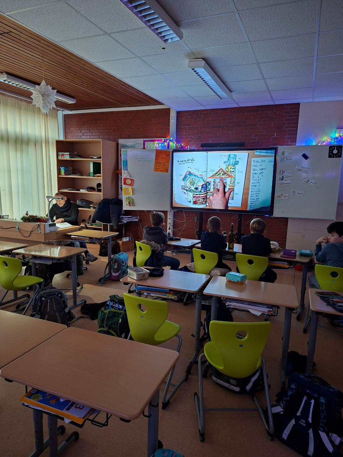 Für den 16. Dezember hatten wir uns für unsere Schulgemeinschaft etwas Besonderes vorgenommen: Wie im vergangenen Jahr wollten wir erneut einen Vorlesetag begehen. Zwanzig ehrenamtliche Vorleser*innen mussten nicht lange gebeten  werden. Gerne folgten sie unserer Einladung, unsere Kinder durch Vorlesen ins Land der Phantasie zu begleiten. Neben Frau Schmiegelt als Vertreterin der Kirchengemeinde über den Ortspolizisten Herrn Meyknecht, vom Haster Bäckermeister Welp  bis zu den Musikern von „Mr. Hurley und die Pulveraffen“ waren auch einige Vertreterinnen des Vereins Mentor, einige Großmütter von Schüler*innen und auch ehemalige Kolleginnen der Grundschule aktiv dabei. Für die kleinen Vorlesegruppen wurden mit Kissen und Decken gemütliche Leseinseln geschaffen, wo es sich den verschiedenen Geschichten herrlich lauschen ließ. Die Kinder hatten von zuhause ihre Kuscheltiere und Kissen mitbringen dürfen, und so breitete sich eine ganz besondere Atmosphäre im Schulgebäude aus. Auch im Mehrgenerationenhaus war Platz geschaffen worden, um all die Gruppen unterbringen zu können. Im Anschluss an das Vorlesen fand dann in der Aula noch ein großer Bücherflohmarkt statt. Gespendete Bücher wechselten für kleines Geld den Besitzer und es konnte so manches Bücher-Schnäppchen gemacht werden, was einen Erlös von über 300 € erbrachte.