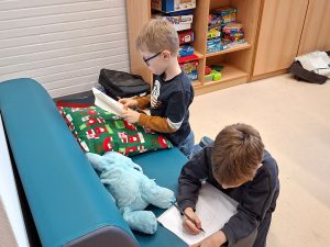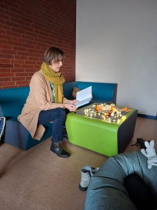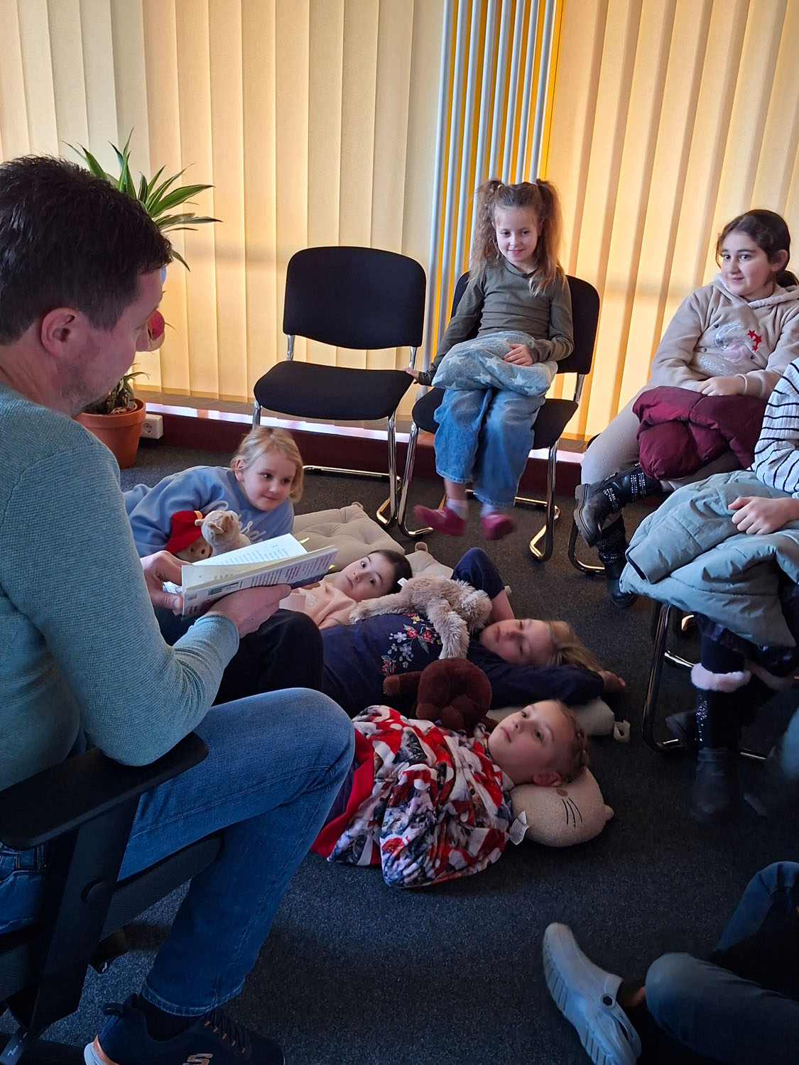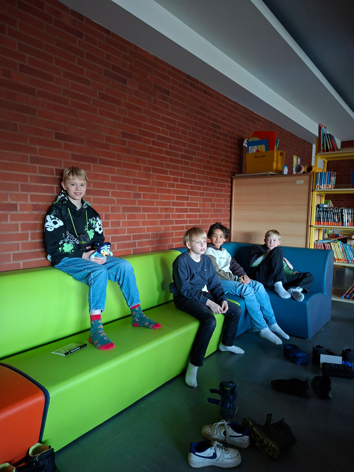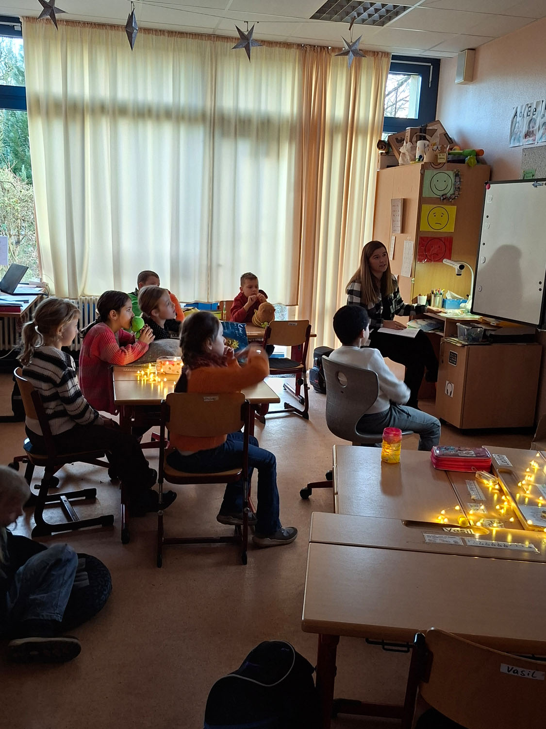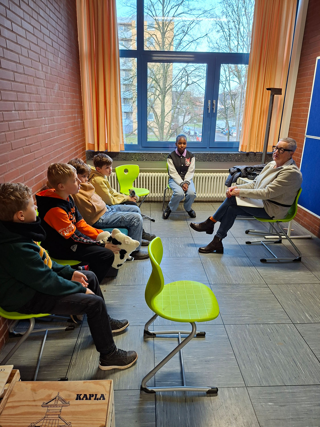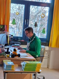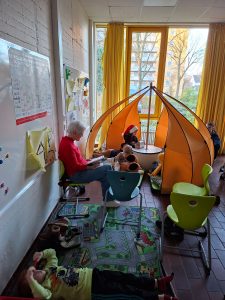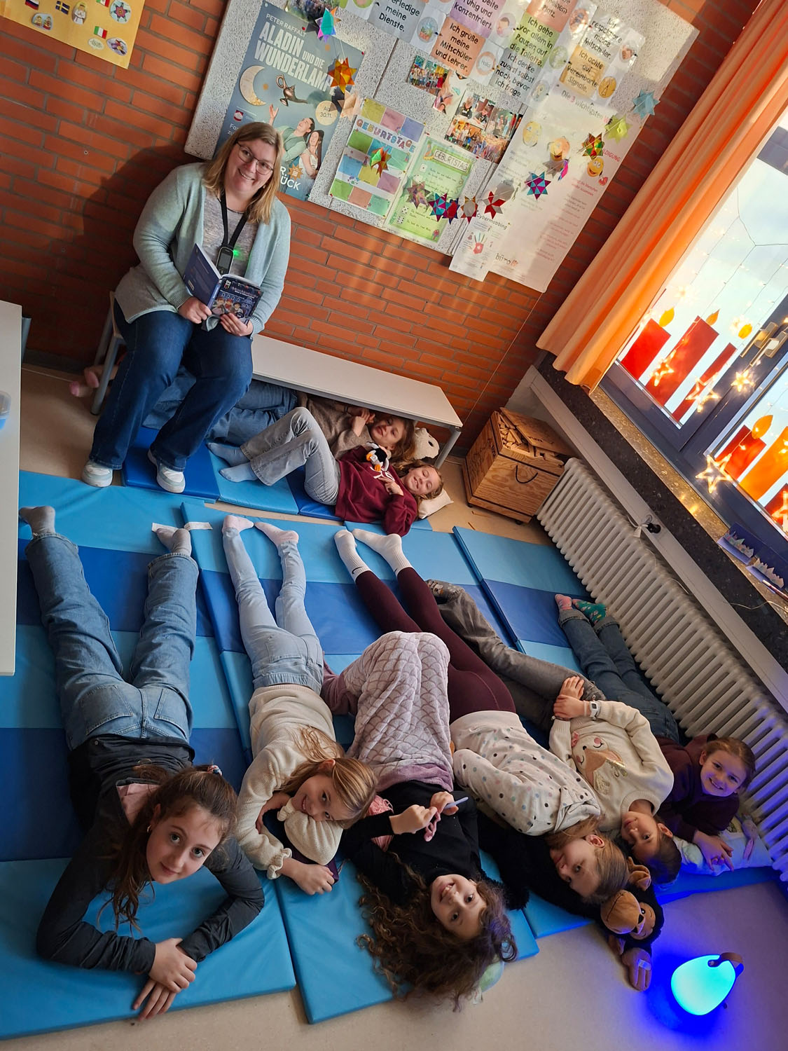 Für den 16. Dezember hatten wir uns für unsere Schulgemeinschaft etwas Besonderes vorgenommen: Wie im vergangenen Jahr wollten wir erneut einen Vorlesetag begehen. Zwanzig ehrenamtliche Vorleser*innen mussten nicht lange gebeten  werden. Gerne folgten sie unserer Einladung, unsere Kinder durch Vorlesen ins Land der Phantasie zu begleiten. Neben Frau Schmiegelt als Vertreterin der Kirchengemeinde über den Ortspolizisten Herrn Meyknecht, vom Haster Bäckermeister Welp  bis zu den Musikern von „Mr. Hurley und die Pulveraffen“ waren auch einige Vertreterinnen des Vereins Mentor, einige Großmütter von Schüler*innen und auch ehemalige Kolleginnen der Grundschule aktiv dabei. Für die kleinen Vorlesegruppen wurden mit Kissen und Decken gemütliche Leseinseln geschaffen, wo es sich den verschiedenen Geschichten herrlich lauschen ließ. Die Kinder hatten von zuhause ihre Kuscheltiere und Kissen mitbringen dürfen, und so breitete sich eine ganz besondere Atmosphäre im Schulgebäude aus. Auch im Mehrgenerationenhaus war Platz geschaffen worden, um all die Gruppen unterbringen zu können. Im Anschluss an das Vorlesen fand dann in der Aula noch ein großer Bücherflohmarkt statt. Gespendete Bücher wechselten für kleines Geld den Besitzer und es konnte so manches Bücher-Schnäppchen gemacht werden, was einen Erlös von über 300 € erbrachte.