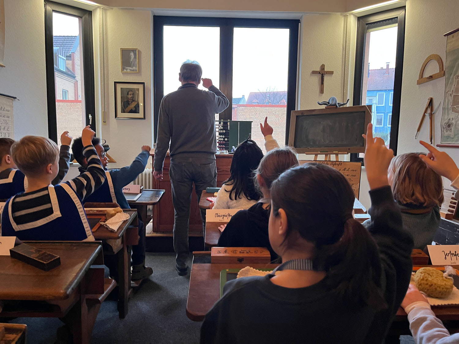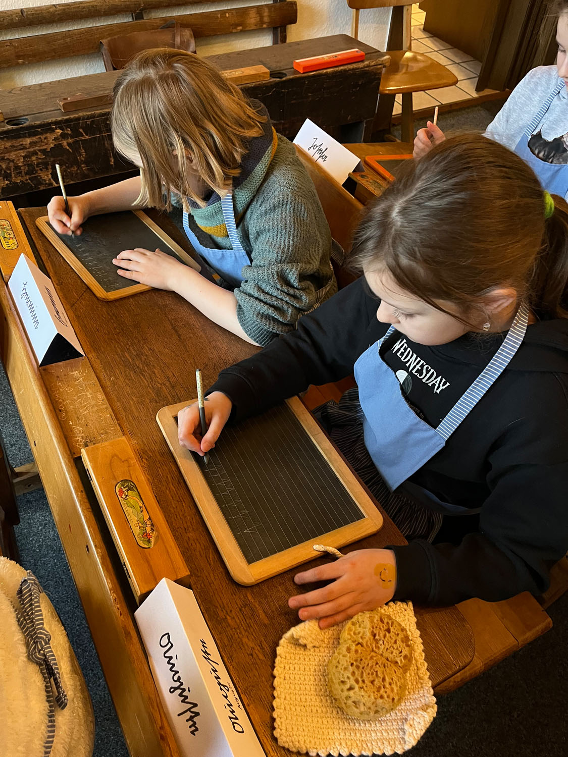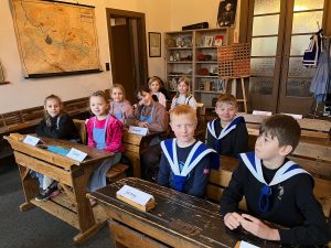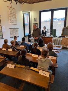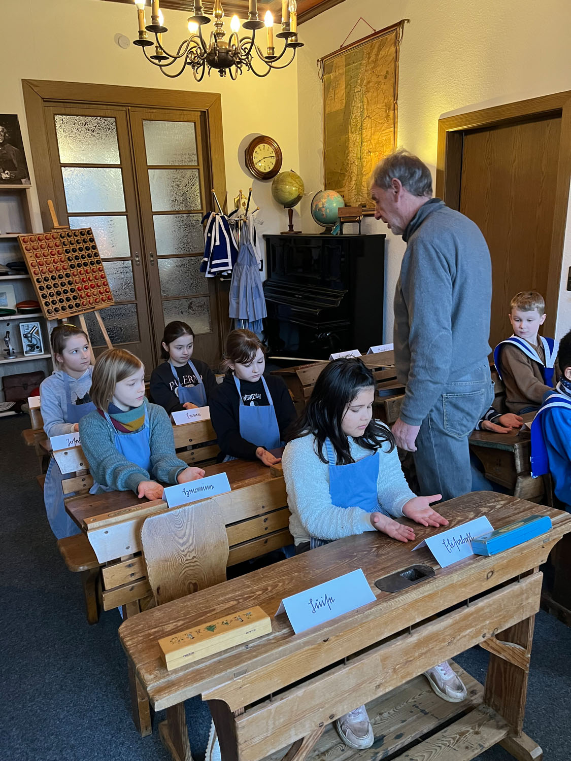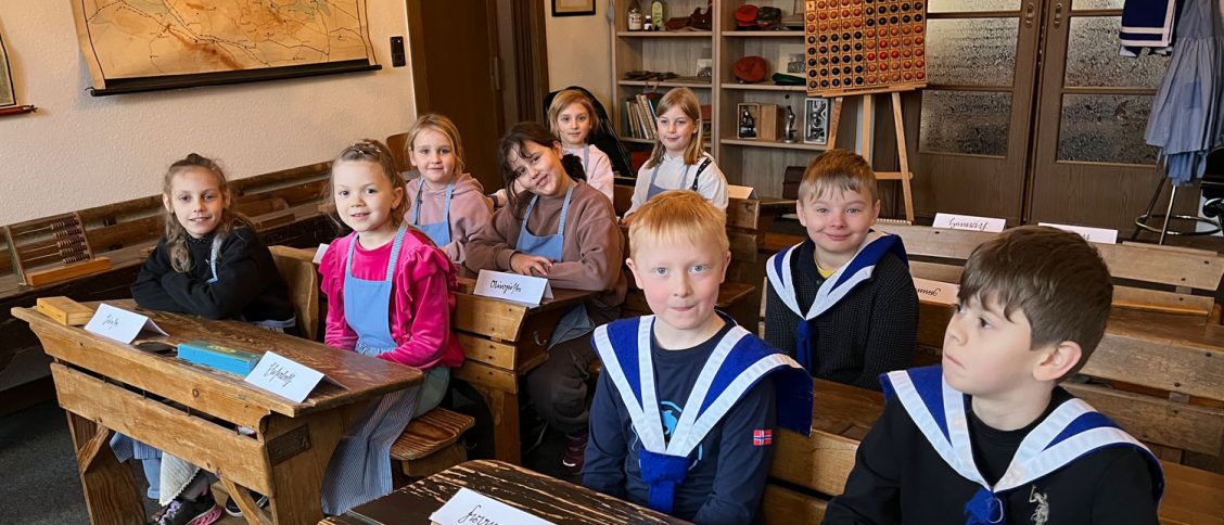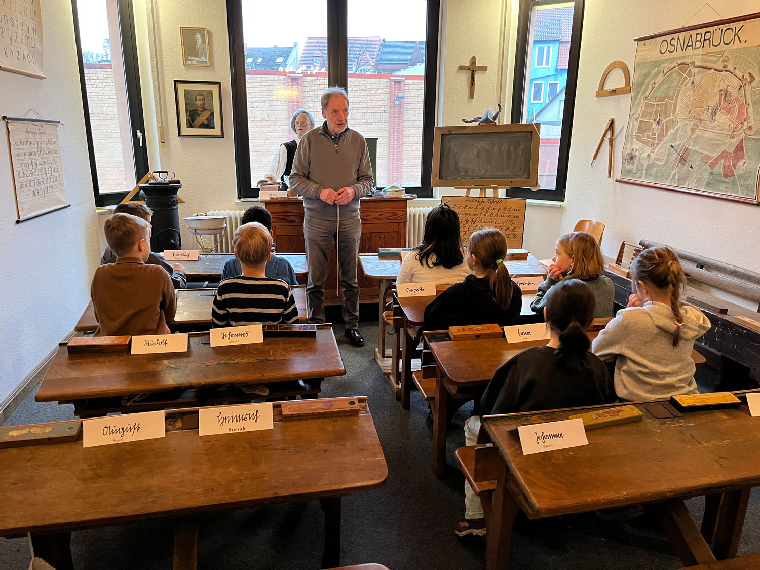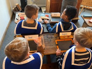 Im Rahmen des Themas „Zeit“ im Sachunterricht besuchte in der letzten Woche unser zweiter Jahrgang das Osnabrücker Schulmuseum. Neben zahlreichen Ausstellungsstücken, wie alte Schulranzen, Bücher, Karten, Atlanten,… durften die Kinder einmal hautnah erleben, wie vor circa 100 Jahren ein normaler Schultag für die Kinder ausgesehen hat: still sitzen, Hände nebeneinander auf dem Tisch, zur Antwort immer neben den Platz stellen und mit Herr Lehrer antworten, schreiben auf Schiefertafeln,… Herr Normann und Herr Bruns vom Museum konnten den Kindern viel über den Schulalltag zur damaligen Zeit erzählen und alle waren sich am Ende einig: Wie gut, dass wir jetzt zur Schule gehen und nicht vor 100 Jahren