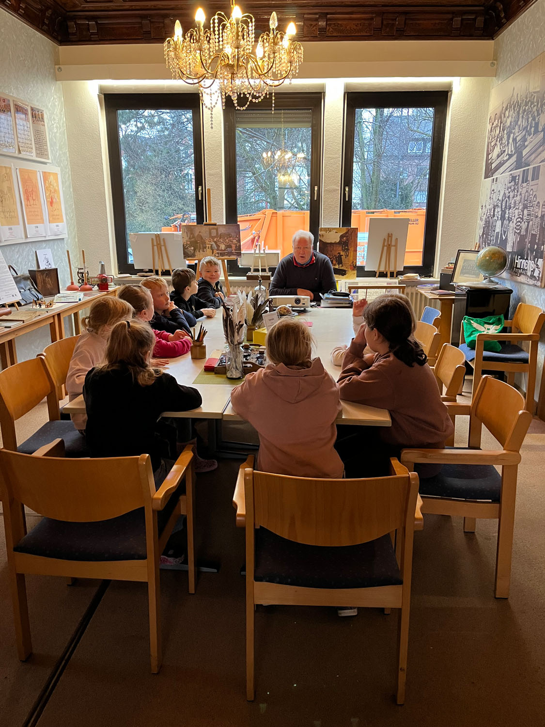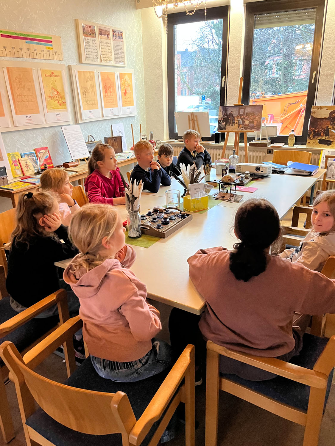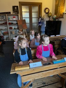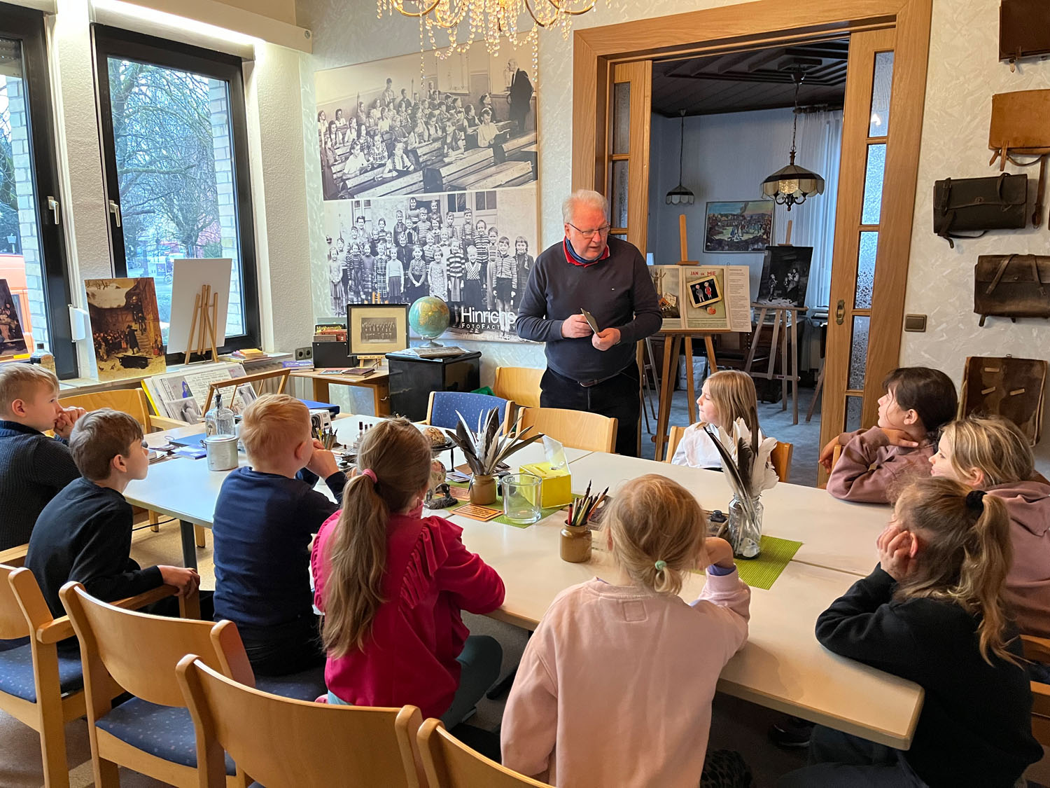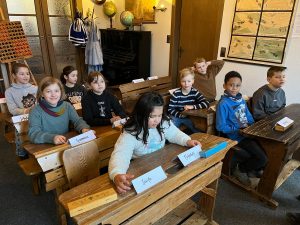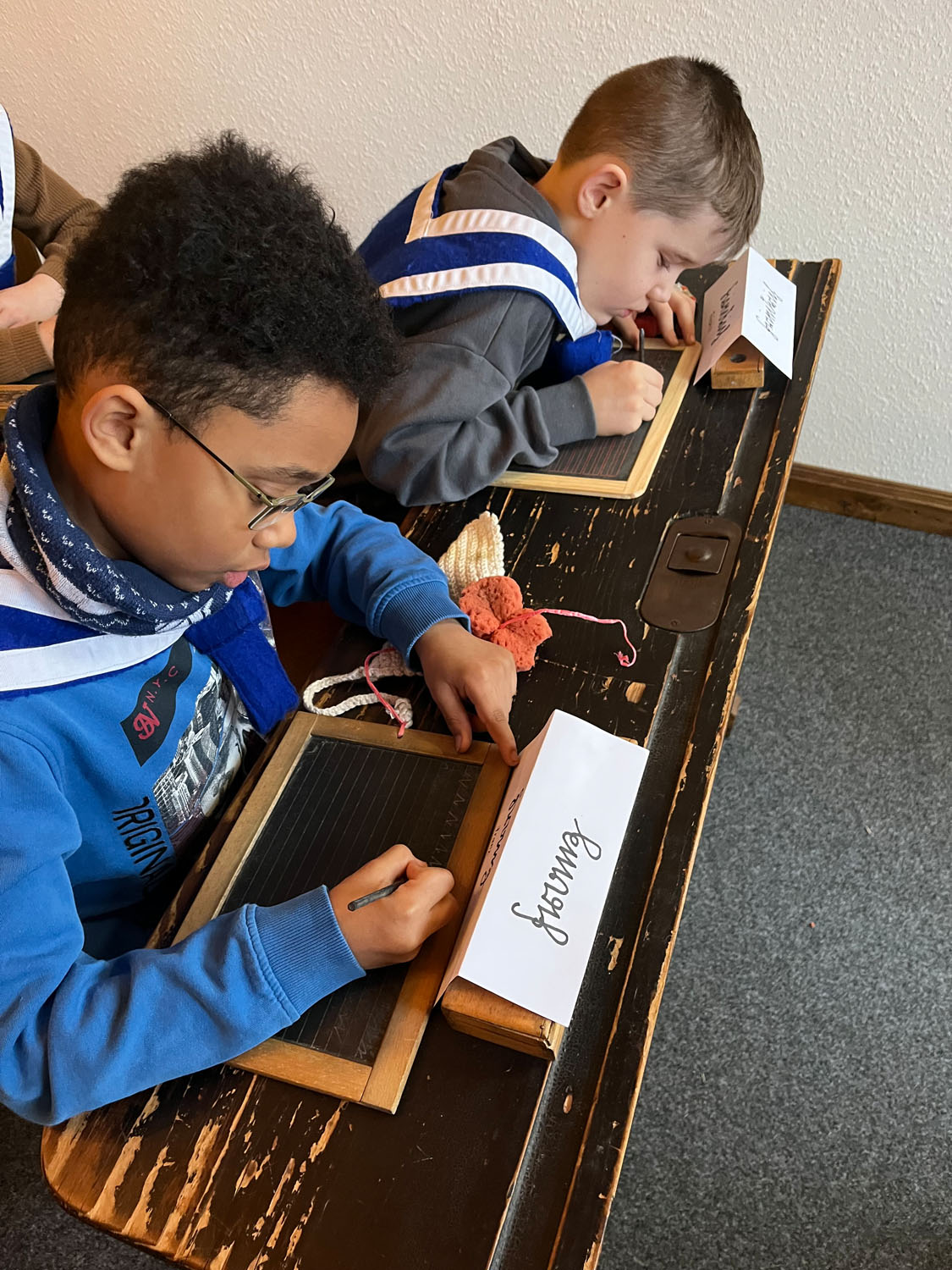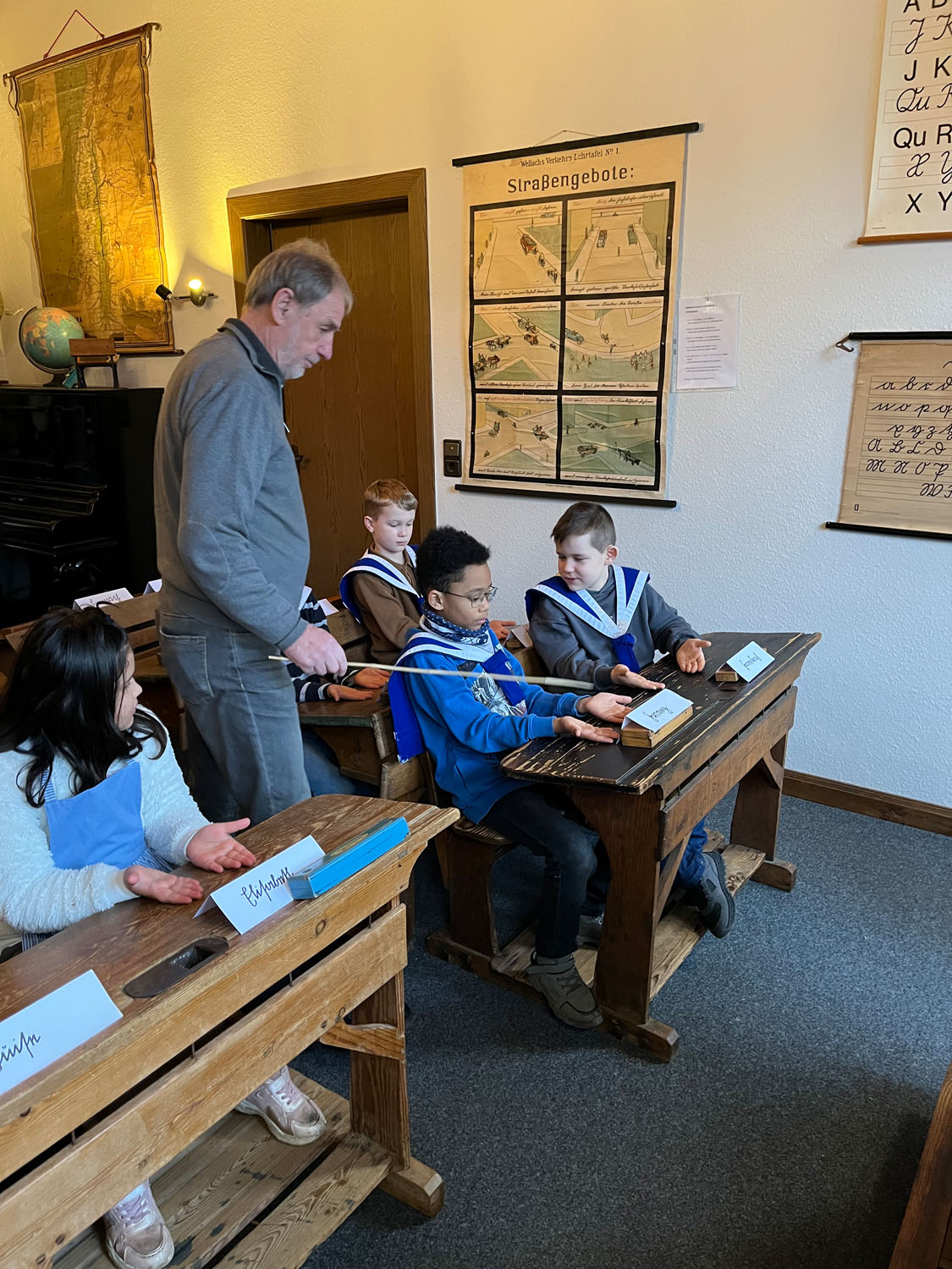 Im Rahmen des Themas „Zeit“ im Sachunterricht besuchte in der letzten Woche unser zweiter Jahrgang das Osnabrücker Schulmuseum. Neben zahlreichen Ausstellungsstücken, wie alte Schulranzen, Bücher, Karten, Atlanten,… durften die Kinder einmal hautnah erleben, wie vor circa 100 Jahren ein normaler Schultag für die Kinder ausgesehen hat: still sitzen, Hände nebeneinander auf dem Tisch, zur Antwort immer neben den Platz stellen und mit Herr Lehrer antworten, schreiben auf Schiefertafeln,… Herr Normann und Herr Bruns vom Museum konnten den Kindern viel über den Schulalltag zur damaligen Zeit erzählen und alle waren sich am Ende einig: Wie gut, dass wir jetzt zur Schule gehen und nicht vor 100 Jahren