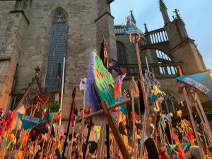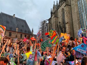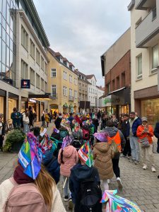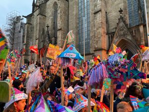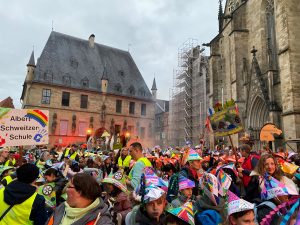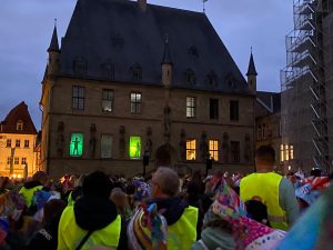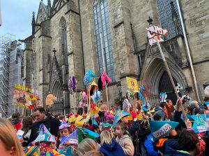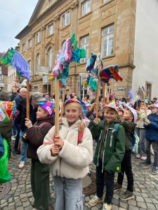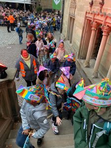 Und dann war der große Tag des Steckenpferdreitens endlich da. Los ging es nach einer Begrüßung von Katharina Pötter auf dem Schulhof der Domschule über den Herrenteichswall in Richtung Marktplatz. Viele Eltern säumten den Weg dorthin und zollten den Kindern Bewunderung für ihre tollen Pferde und Hüte. Nach dem Ritt über die Rathaustreppe, gab es endlich die ersehnte süße Brezel. Doch das war noch lange nicht das Ende. Weiter ging es mit einem tollen Programm auf dem Rathausplatz mit Musik, dem Streit der Farben, Feuershow und erstmalig einer beeindruckenden Laser-Show. An diesen aufregenden Tag können sich unsere ViertklässerInnen sicherlich noch lange erinnern.