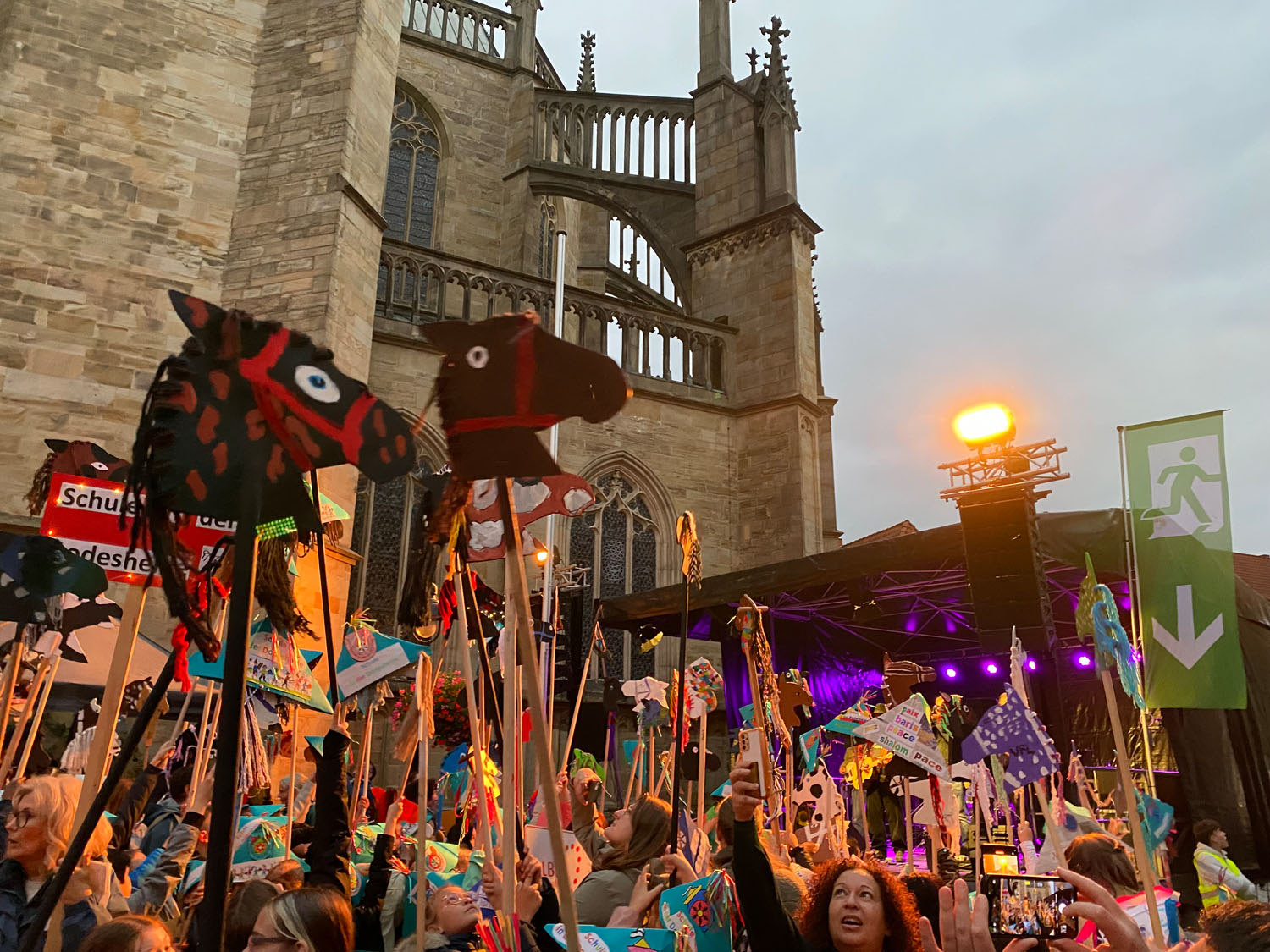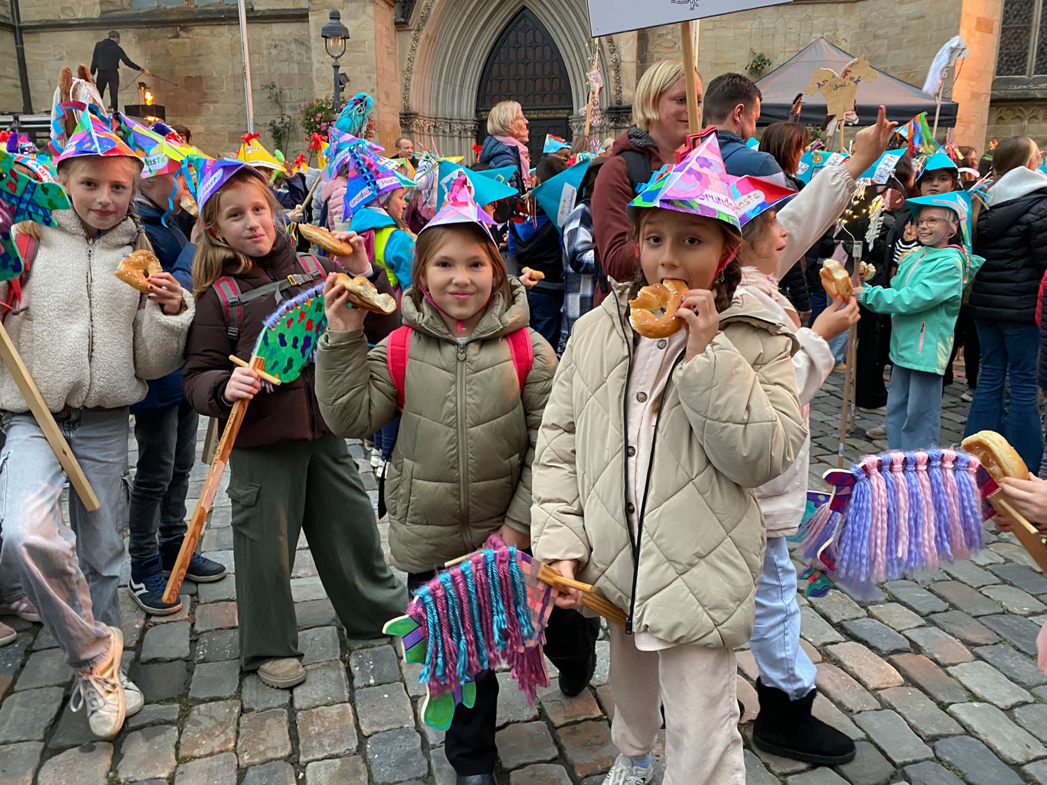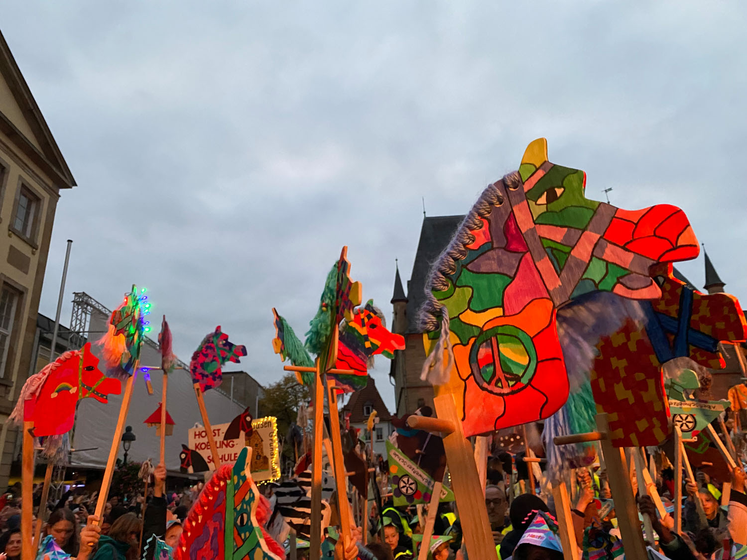 Und dann war der große Tag des Steckenpferdreitens endlich da. Los ging es nach einer Begrüßung von Katharina Pötter auf dem Schulhof der Domschule über den Herrenteichswall in Richtung Marktplatz. Viele Eltern säumten den Weg dorthin und zollten den Kindern Bewunderung für ihre tollen Pferde und Hüte. Nach dem Ritt über die Rathaustreppe, gab es endlich die ersehnte süße Brezel. Doch das war noch lange nicht das Ende. Weiter ging es mit einem tollen Programm auf dem Rathausplatz mit Musik, dem Streit der Farben, Feuershow und erstmalig einer beeindruckenden Laser-Show. An diesen aufregenden Tag können sich unsere ViertklässerInnen sicherlich noch lange erinnern.
