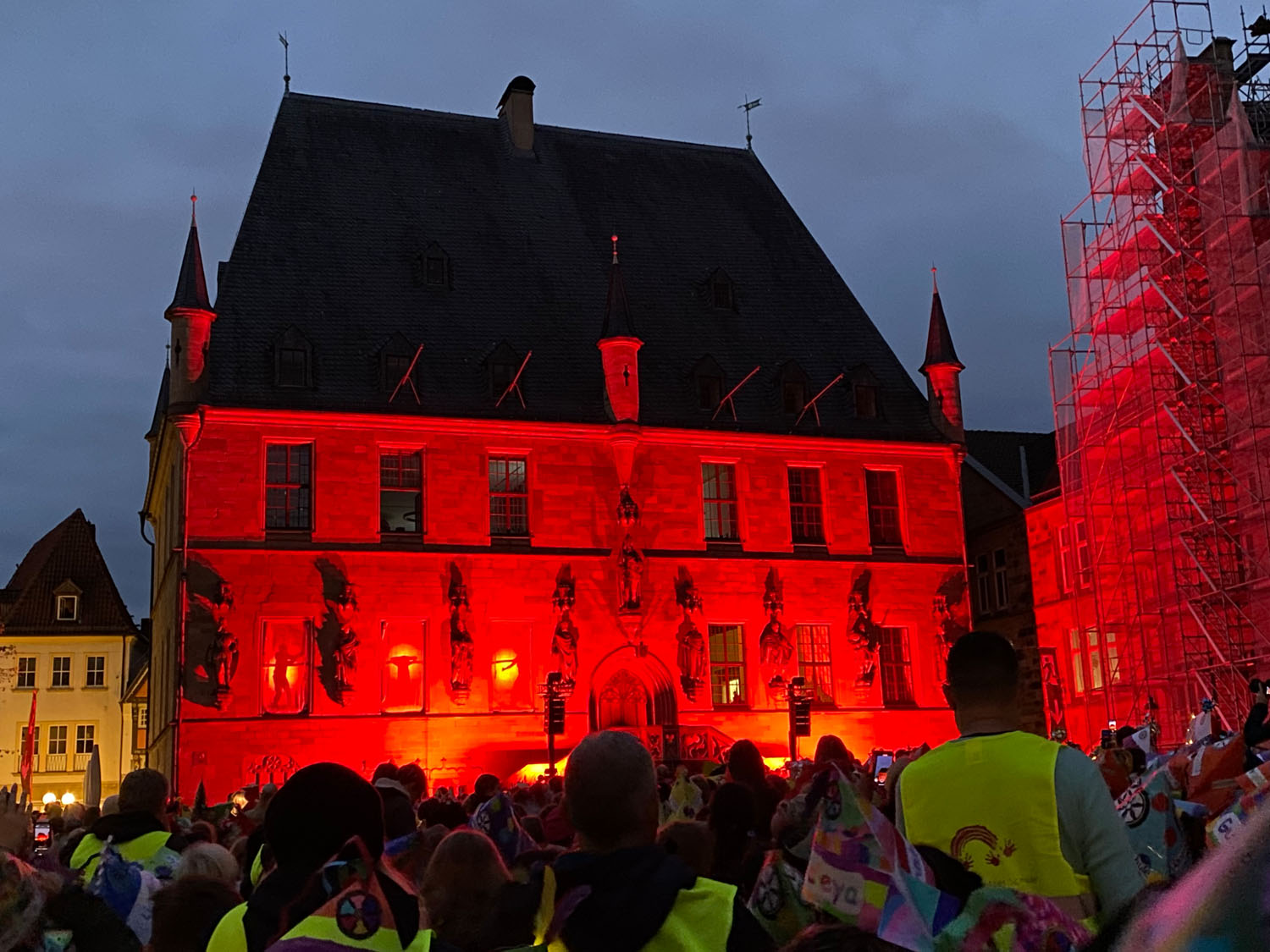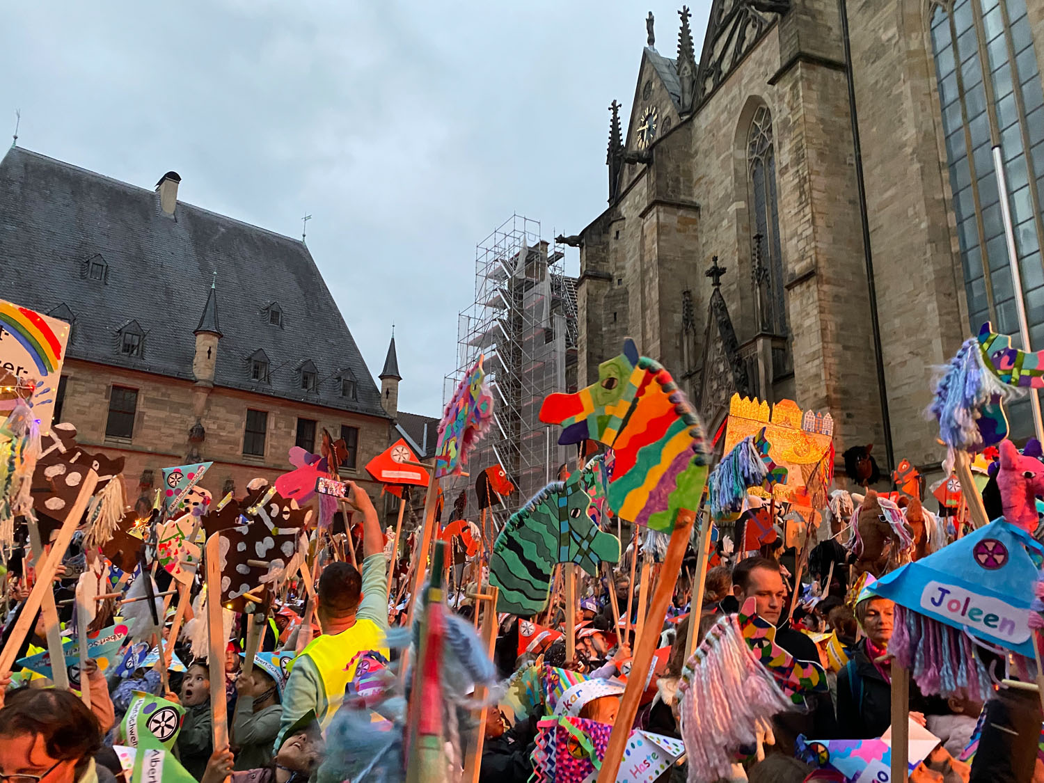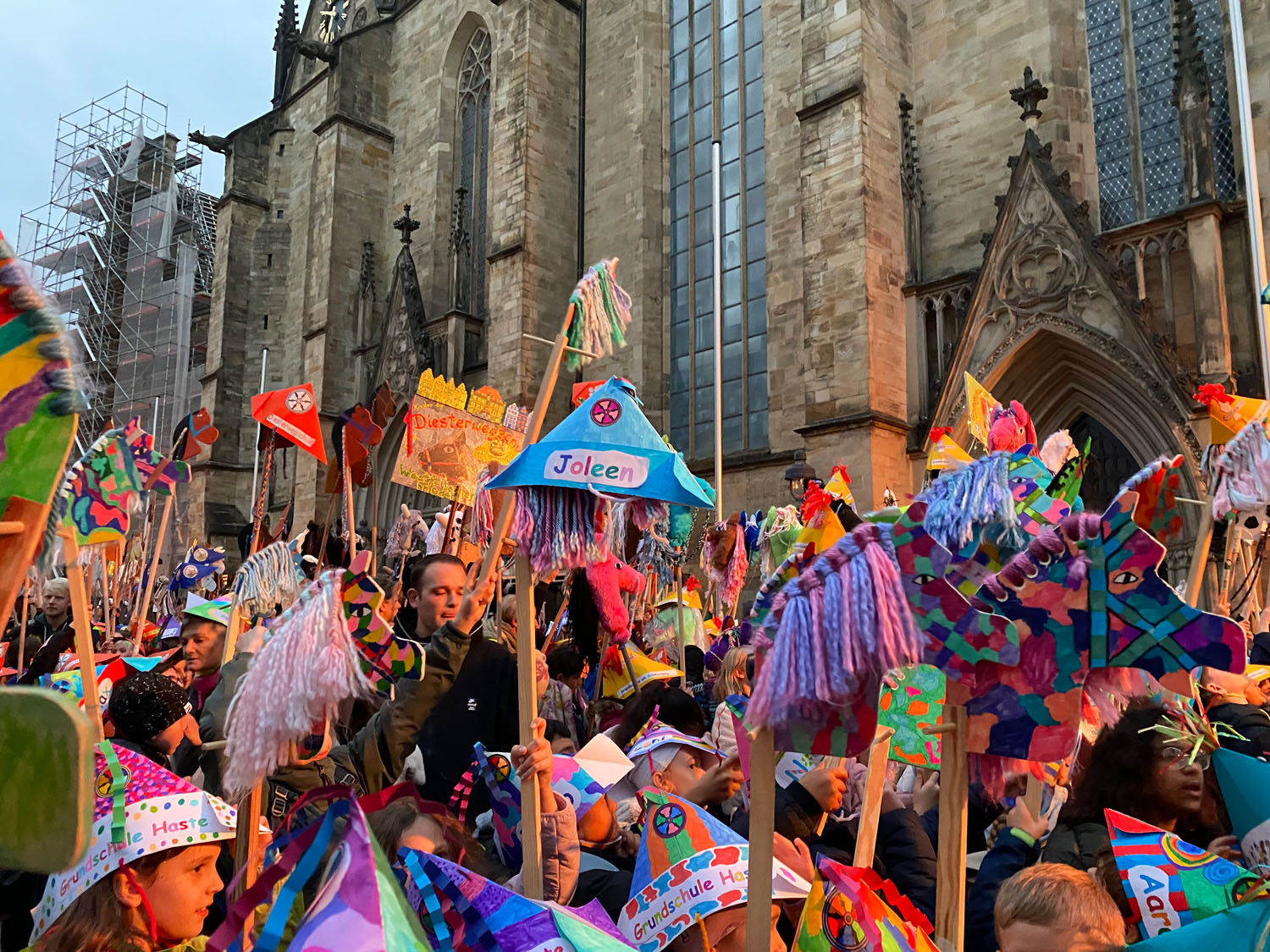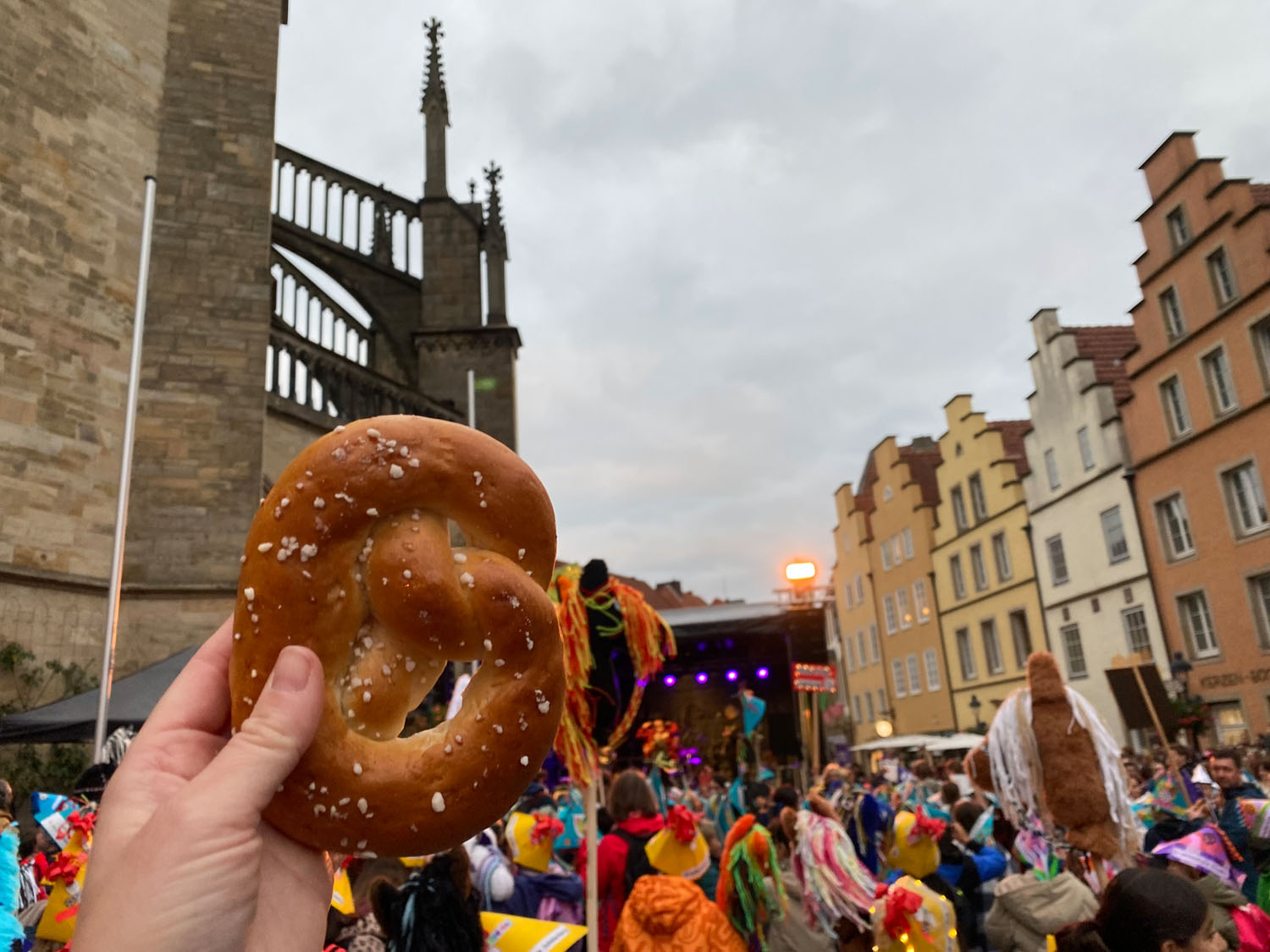 Und dann war der große Tag des Steckenpferdreitens endlich da. Los ging es nach einer Begrüßung von Katharina Pötter auf dem Schulhof der Domschule über den Herrenteichswall in Richtung Marktplatz. Viele Eltern säumten den Weg dorthin und zollten den Kindern Bewunderung für ihre tollen Pferde und Hüte. Nach dem Ritt über die Rathaustreppe, gab es endlich die ersehnte süße Brezel. Doch das war noch lange nicht das Ende. Weiter ging es mit einem tollen Programm auf dem Rathausplatz mit Musik, dem Streit der Farben, Feuershow und erstmalig einer beeindruckenden Laser-Show. An diesen aufregenden Tag können sich unsere ViertklässerInnen sicherlich noch lange erinnern.
